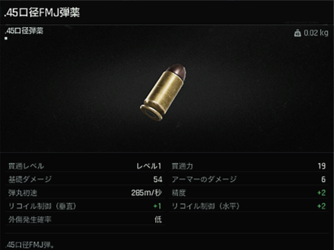 FMJ弾薬とAP弾薬を比べると、貫通力はAPが大きく上回る一方で、基礎ダメージはわずかにFMJの方が高いです。